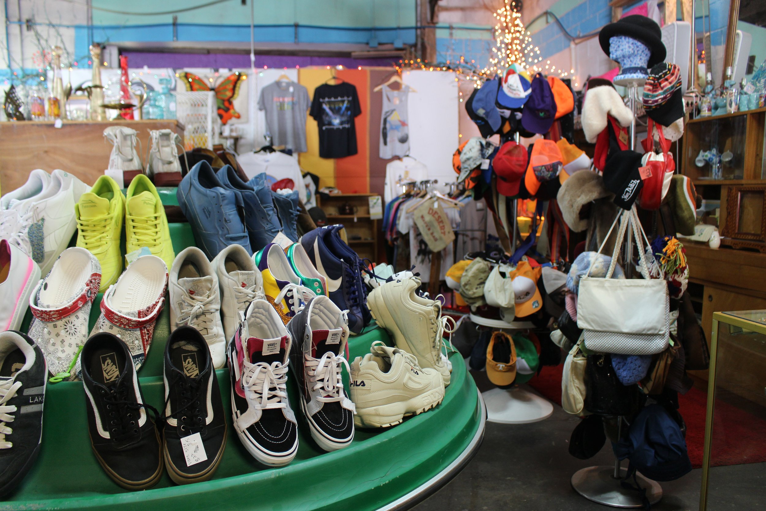 Our last stop was Poor Taste, who has recently constructed a new addition to their store. They added a mini stairway leading up to another level of clothing racks and other eye-catching products. They have an impressive, large variety of vintage shirts to peruse. This store has a little bit of everything to help create your one of a kind outfit: bottoms, shoes, shades and even hats. Their ball cap collection spans almost an entire wall of the store. Their merchandise displays are sure to reel you in. There’s a vintage VHS set up with tons of movies, accompanied by women’s clothing, and an upcycled Oakley display case filled with vintage products. In one of their displays, they have an iMac computer—who still has iMac computers?! You can find Poor Taste right off of Main Street. They are definitely worth the stop!